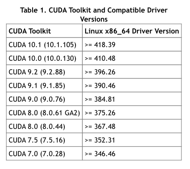 这里需要注意的是高版本的 CUDA 同样需要高版本的驱动,对应关系如下: